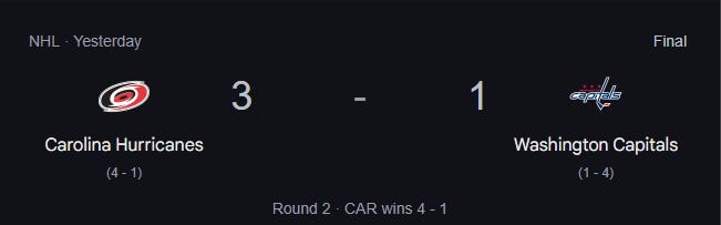 Hurricanes Win Round 2 Series 4-1, After 3-1 Game 5 Victory Over Capitals