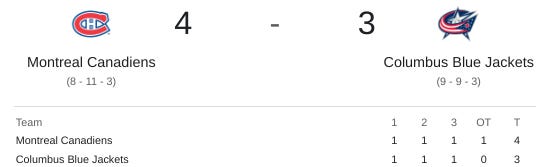 Blue Jackets Lose to Canadiens on Suzuki's OT Goal