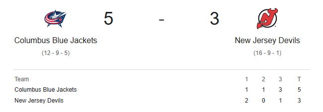 Monahan Scores Twice as Blue Jackets Defeat Devils 5-3
