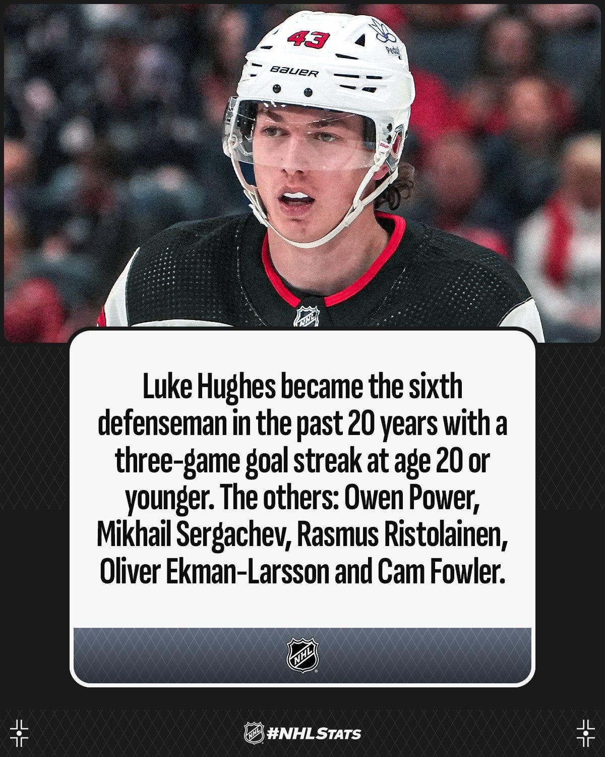 Luke Hughes has an active three-game goal-scoring streak, the longest in Devils history for a rookie defenseman.