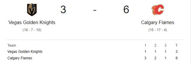 Flames Snap Golden Knights’ 8-Game Point Streak With 6-3 Victory