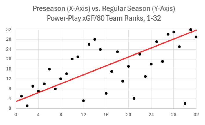 When looking at preseason versus regular-season power plays, there is a moderate correlation. That is, generally speaking, teams that do well in the preseason on the man advantage tend to do the same once the games start to matter.