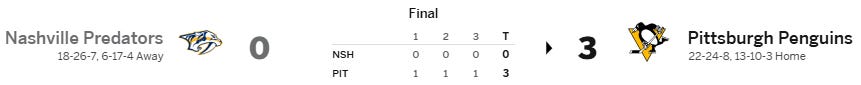 Penguins’ Complete Performance Leads to 3-0 Win Over Predators