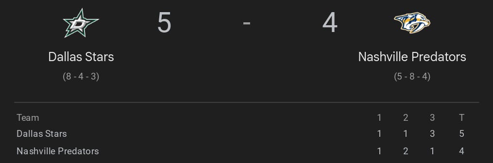 3-Goal Third Period Propels Stars Past Predators in 5-4 Win